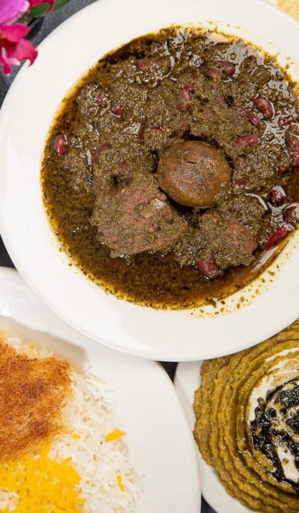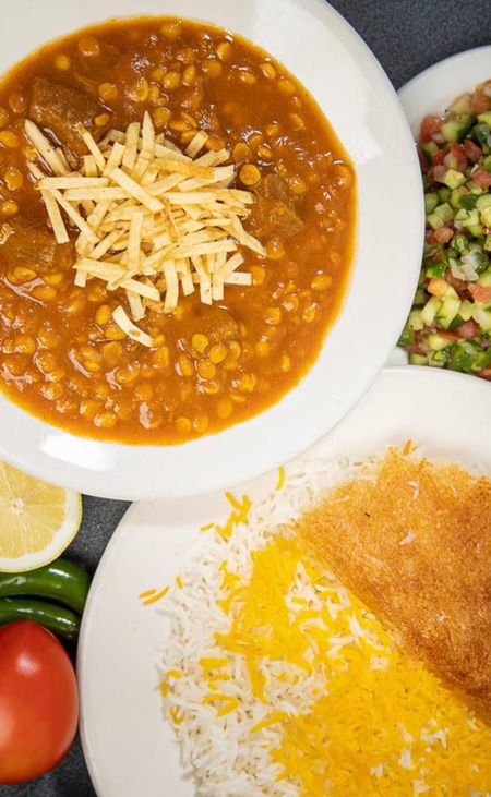 Sautees fried, yellow lentil cooked in to sauce, topped with fried eggplant, served with basmati rice tahdig