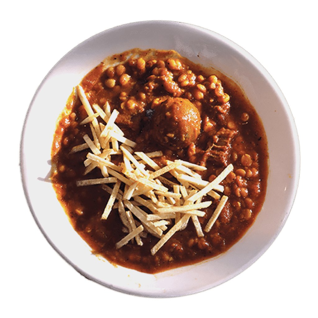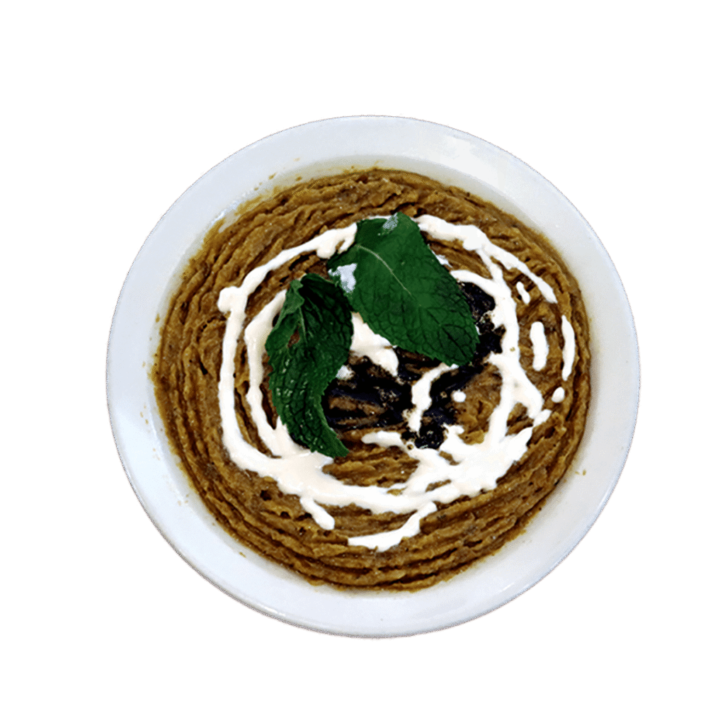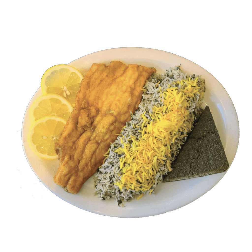 Sautees fried, yellow lentil cooked in to sauce, topped with fried eggplant, served with basmati rice tahdig