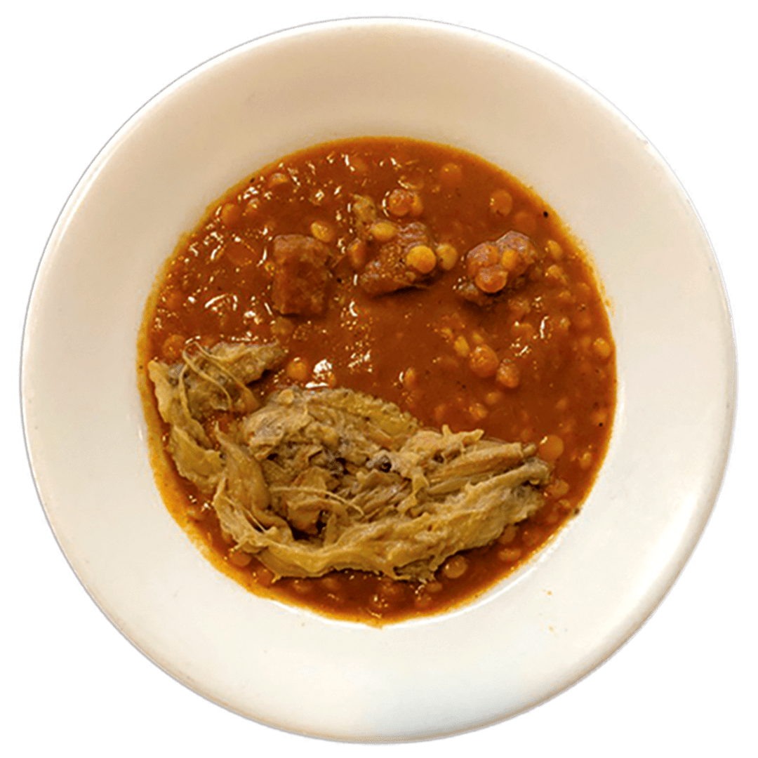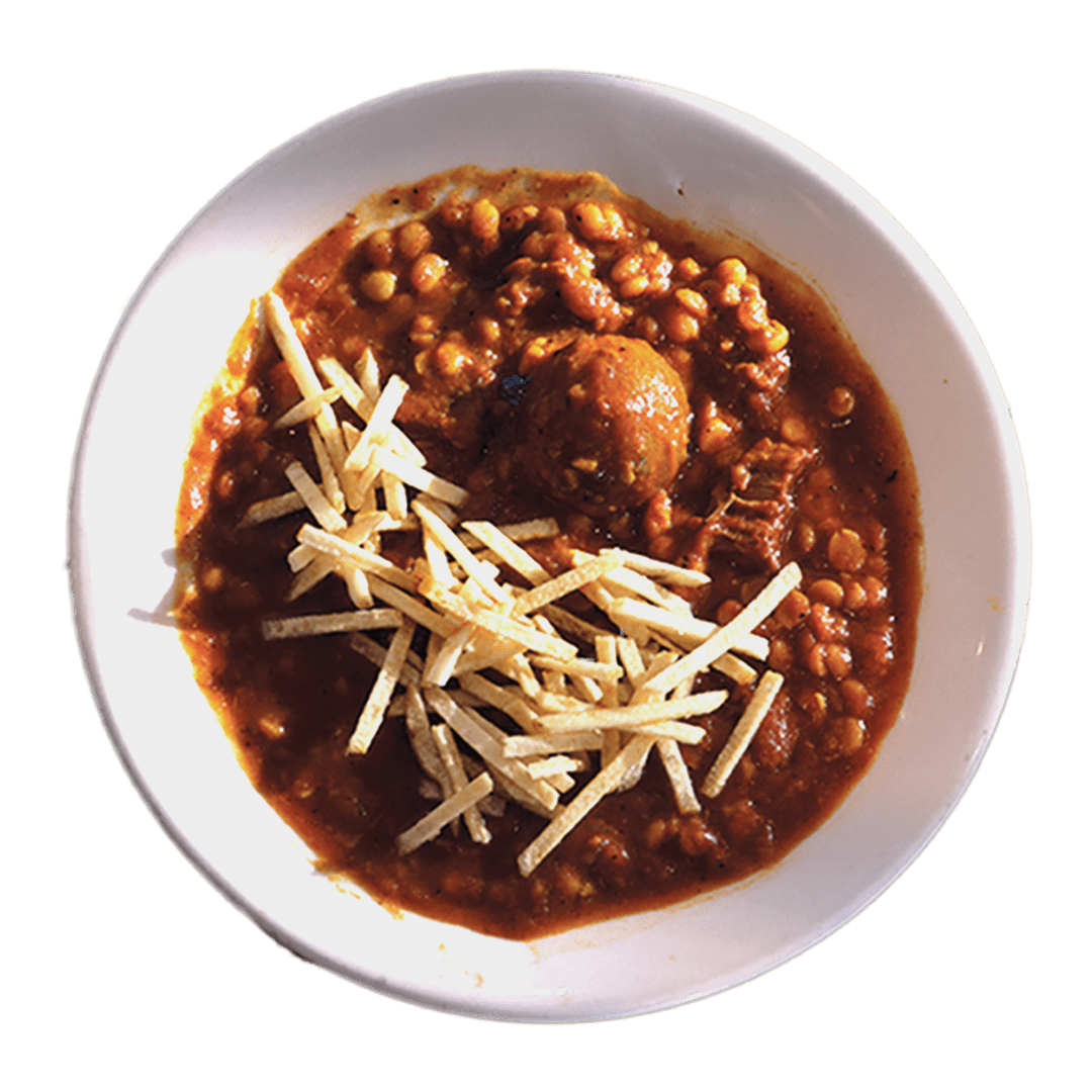 Sautees fried, yellow lentil cooked in tomato sauce, topped with french fries, served with basmati rice & tahdig